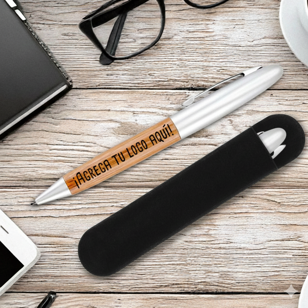 Deluxe Bolígrafo Ejecutivo de Madera de Bamboo con cuerpo superior y clip metálicos satinados.