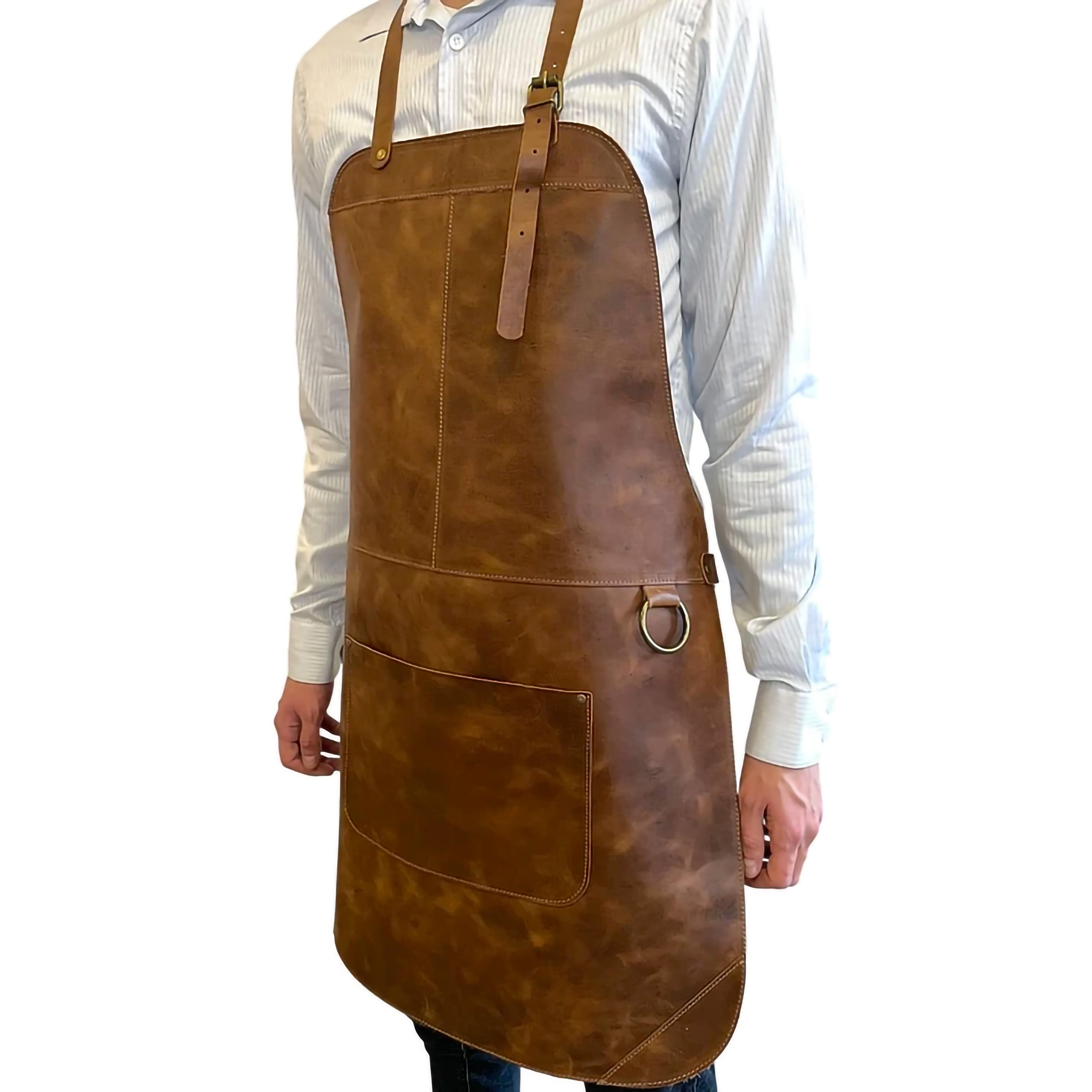 Cuenta con un bolsillo mandíl frontal, un bolsillo lateral para cuchillos o pinzas y una argolla metálica para colgar paños.